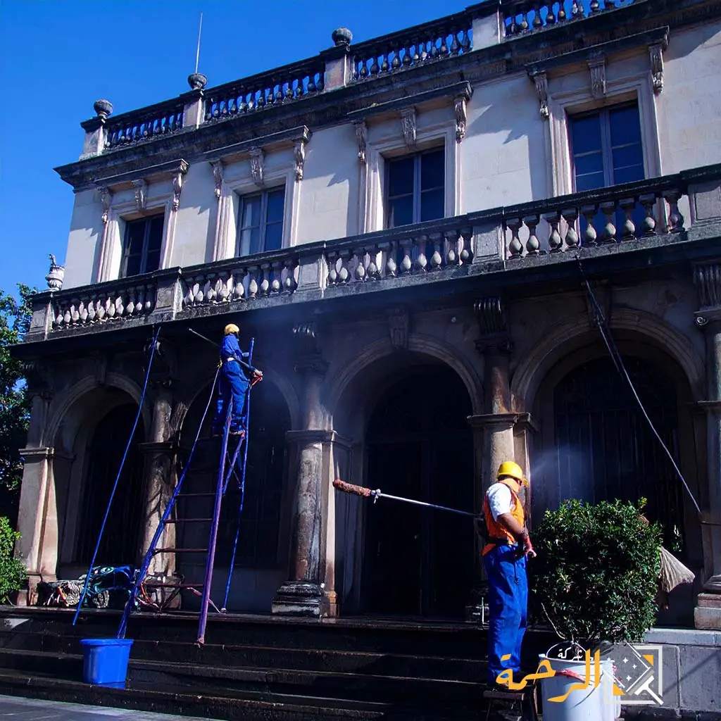 تأتي الخطوة الثانية وهي تجهيز الموقع، حيث يتم تغطية النوافذ والزجاج والمناطق المجاورة لحماية كل الأجزاء من أي مواد تنظيف أو رذاذ ماء. ثم يبدأ الفريق في تنظيف الواجهة باستخدام أجهزة الضغط العالي التي تزيل الأتربة والبقع العالقة بكفاءة عالية دون التسبب في أي ضرر لسطح الحجر.